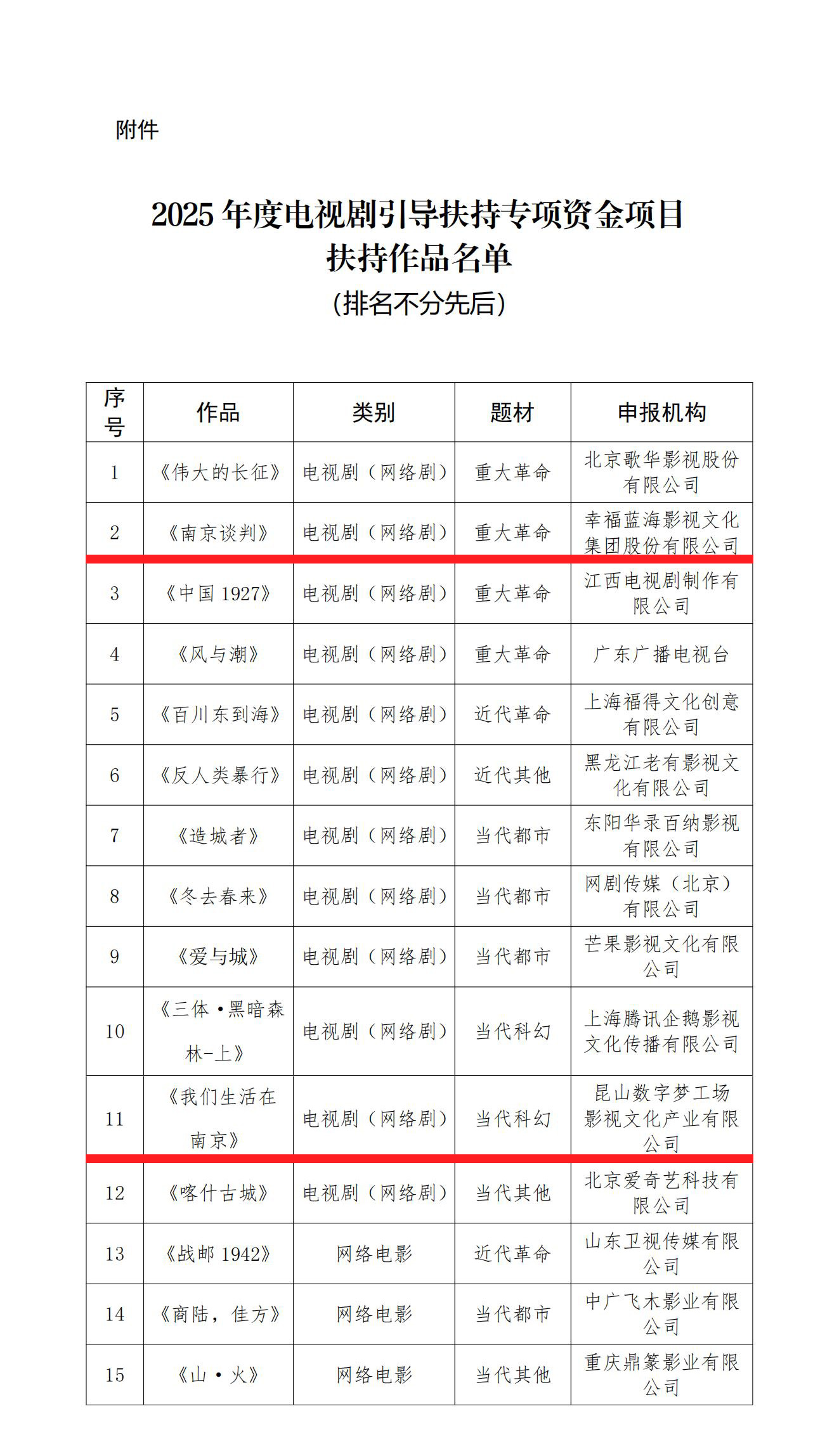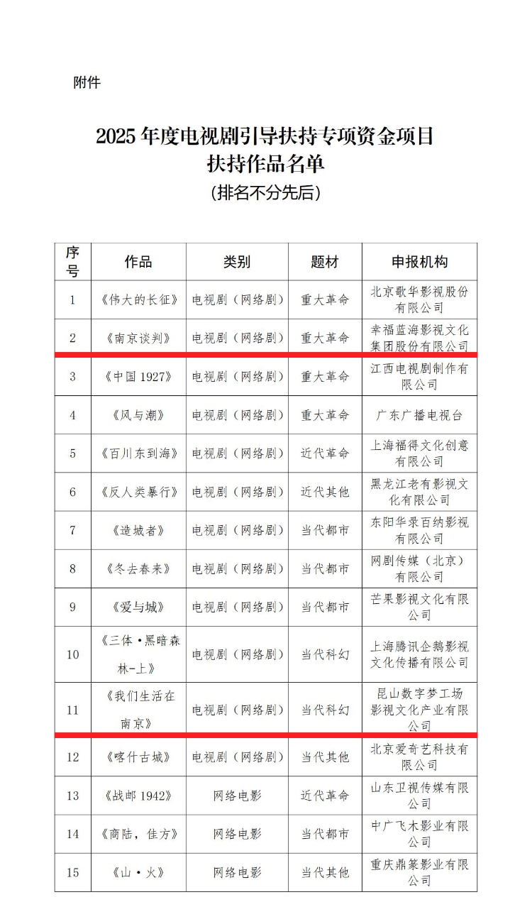 8月13日,国家广播电视总局发布关于公布2025年度电视剧引导扶持专项资金项目评审结果的通知。我省立项出品的重大革命题材电视剧《南京谈判》、当代科幻题材电视剧《我们生活在南京》入选“国家广电总局2025年电视剧引导扶持专项资金项目”。
