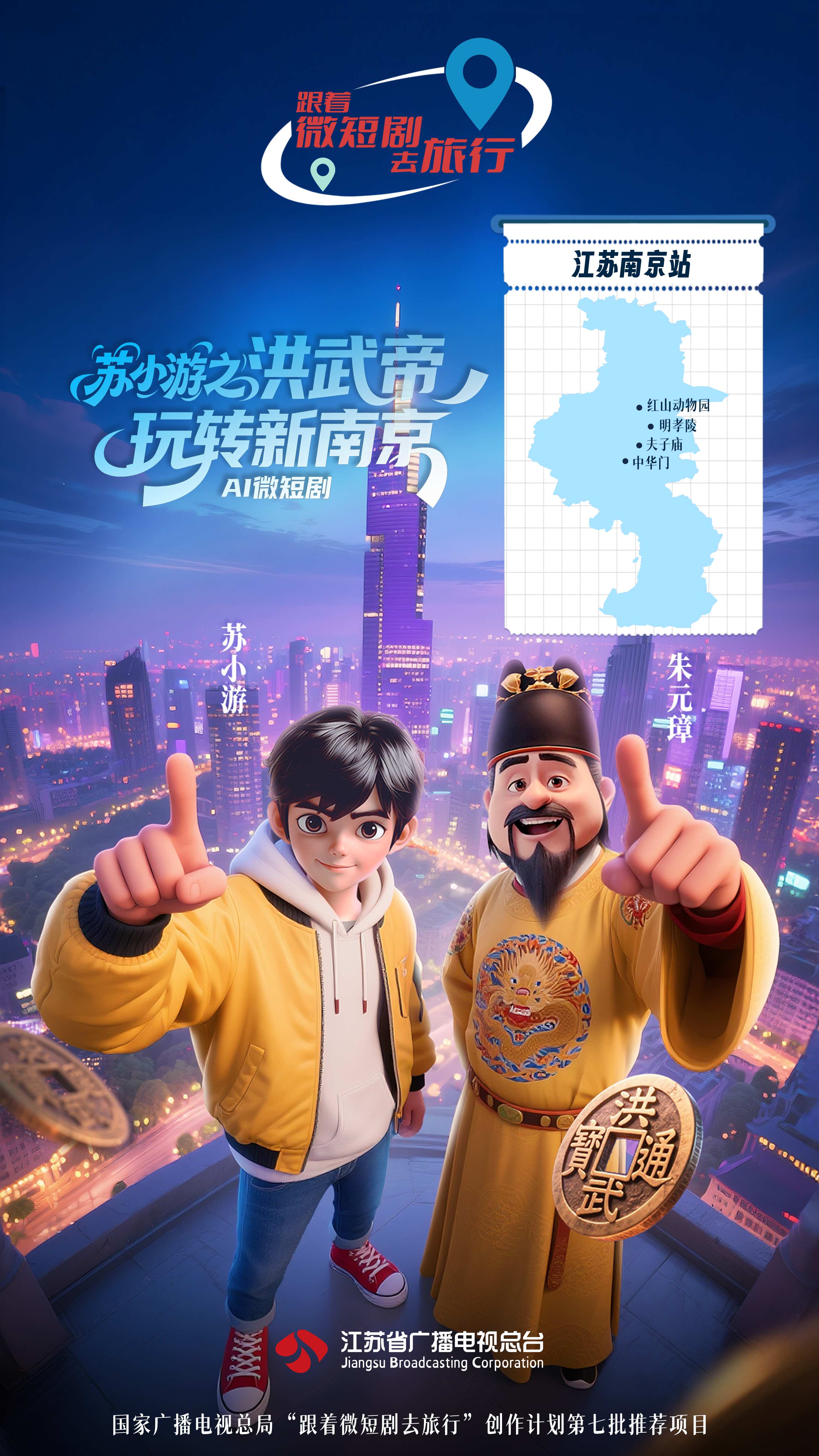 《苏小游之洪武帝玩转新南京》由江苏省广播电视总台出品,江苏综艺频道AIGC创视界融媒工作室制作,3分钟*6集,取景地为江苏南京明孝陵、夫子庙、秦淮河、江南贡院、明城墙、玄武湖、红山动物园、紫金山索道、科巷、南京眼、长江大桥等。讲述了洪武帝朱元璋穿越回当代,与旅游博主苏小游同游南京众多世界级文化遗产与城市文旅地标的故事,融合AI技术展现了南京古都的历史纵深与创新活力。