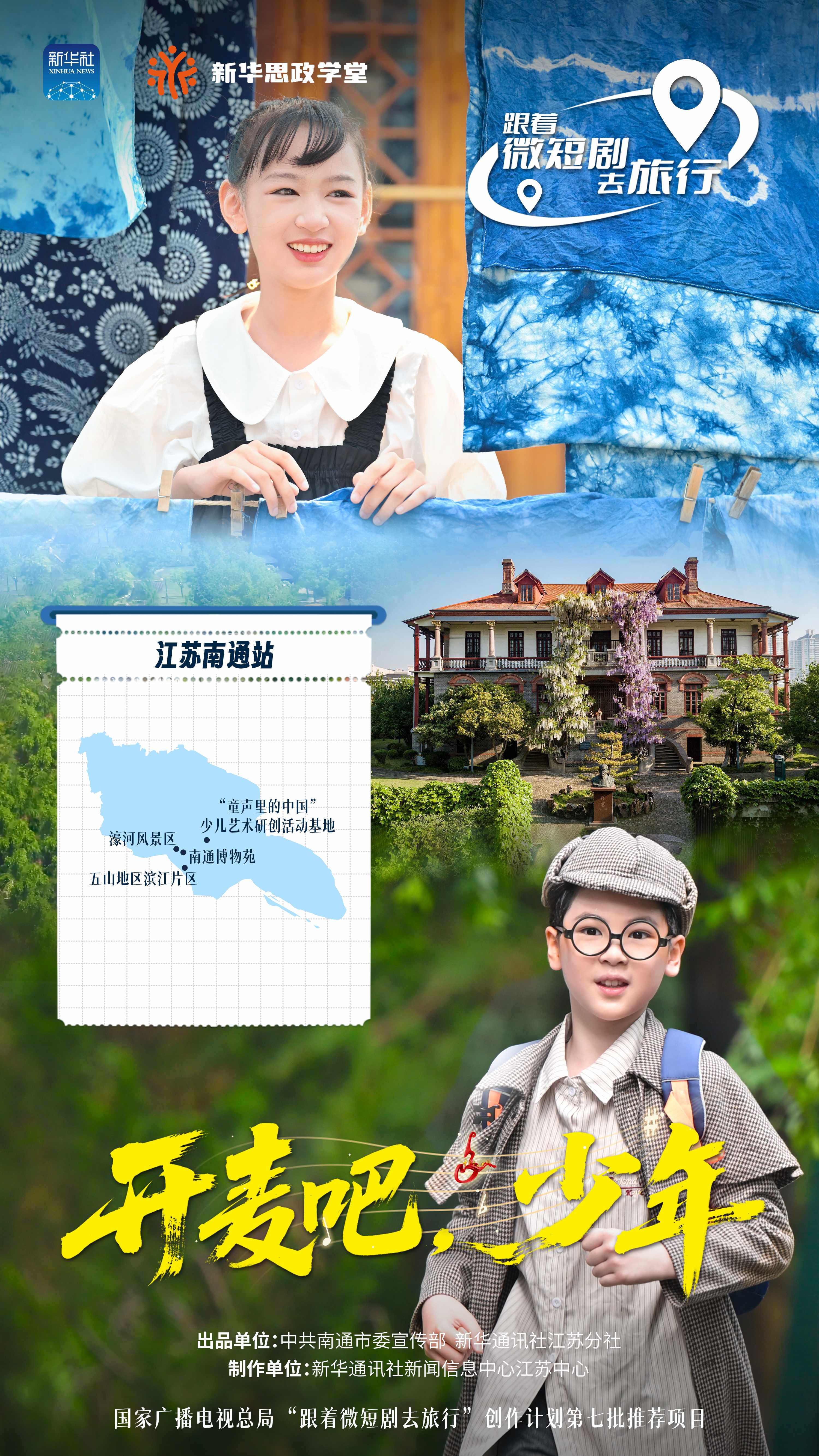 《开麦吧,少年》由中共南通市委宣传部与新华通讯社江苏分社出品,新华社新闻信息中心江苏中心制作,10分钟*8集,取景地为南通市“童声里的中国”少儿艺术研创活动基地、南通博物苑、濠河风景区、五山滨江片区。讲述了姐弟俩借助“时空望远镜”解码“近代第一城”文化记忆和城市精神,在与先贤对话中获得成长启示的历程,展现了江海文脉绘就的美育故事与新时代青少年的成长画卷。