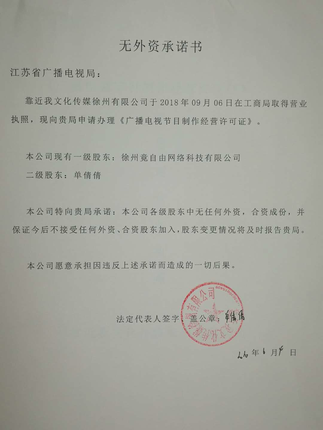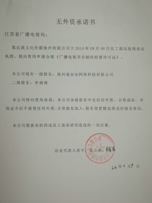 靠近我文化传媒徐州有限公司承诺书
