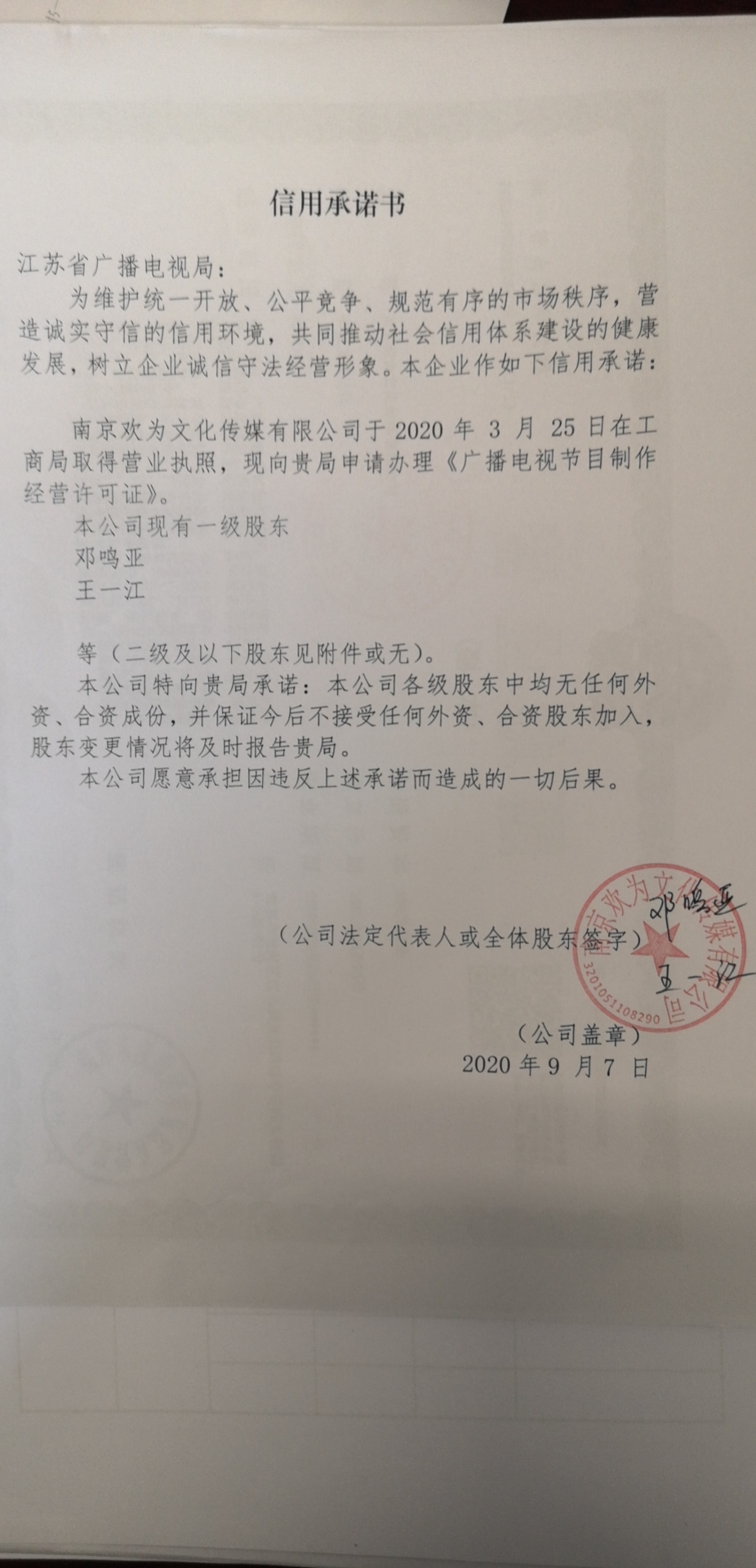 南京欢为文化传媒有限公司承诺书